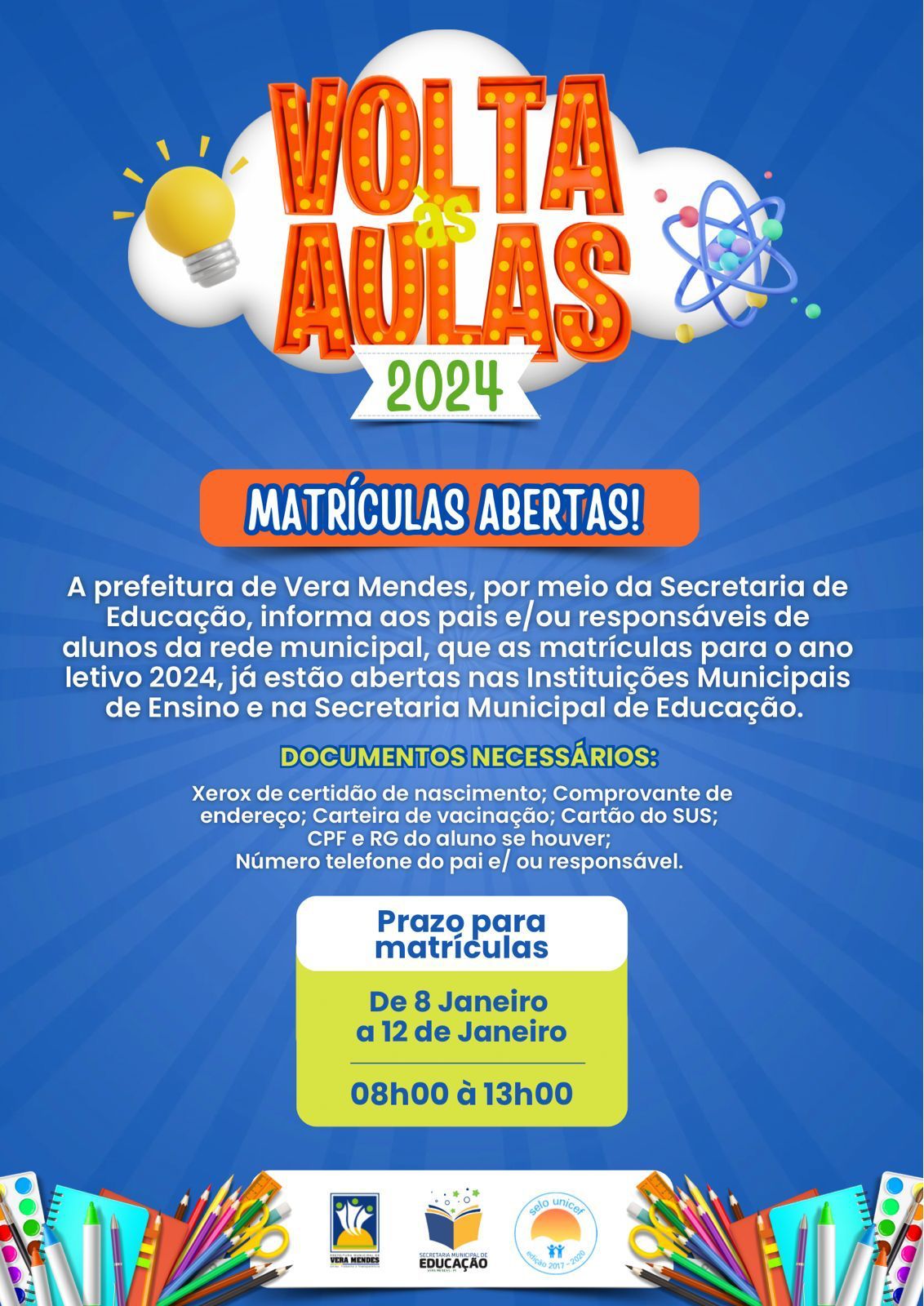 A prefeitura Municipal de Vera Mendes do Piauí, através da Secretaria de Educação, anunciou a abertura das matrículas para o ano letivo de 2024 nas escolas municipais. A medida visa proporcionar aos pais e responsáveis a oportunidade de garantir a vaga de seus filhos nas Instituições Municipais de Ensino.