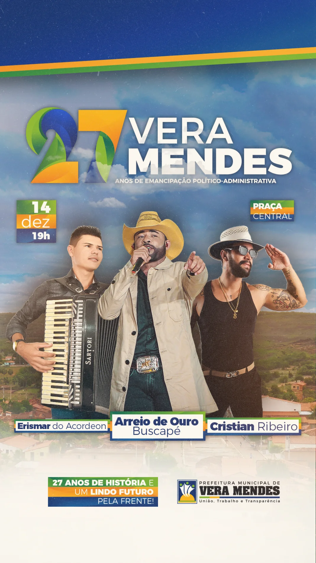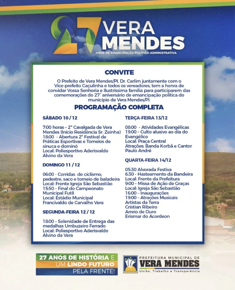 O Governo Municipal de Vera Mendes — PI, gestão “União, Trabalho e Transparência”, por meio do prefeito Dr. Carlim, divulgou nesta segunda-feira, dia 21 de novembro, as atrações artísticas e toda a programação comemorativa ao 27º aniversário de emancipação política — administrativa do município, que acontece no próximo dia 14 de dezembro.